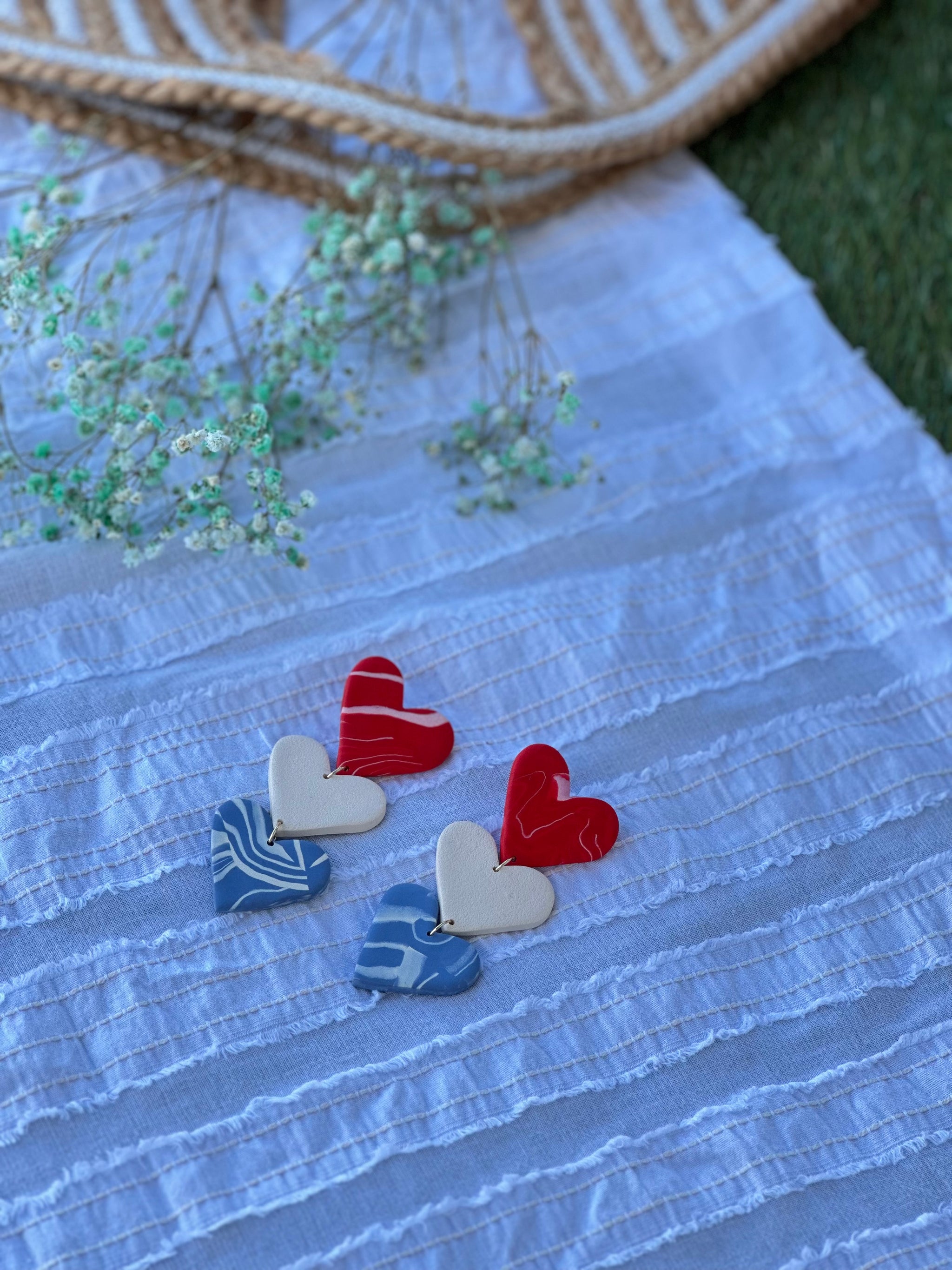 Pantallas de 3 corazones grandes en arcilla polímerica y studs en stainless steel. Mide aproximadamente 4 pulgadas de largo.